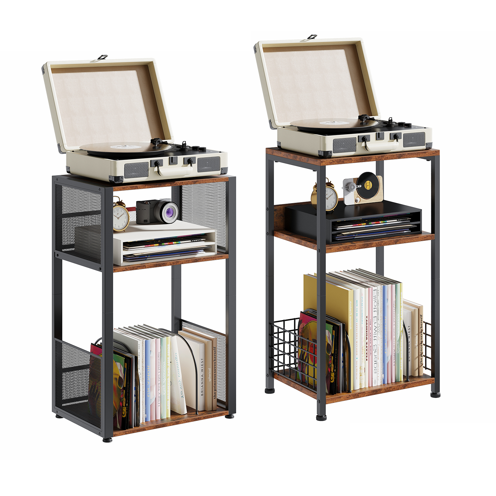 Set de 2 Mesas Laterales de 3 Niveles con Soporte para Tocadiscos y 100 Discos de Vinilo
