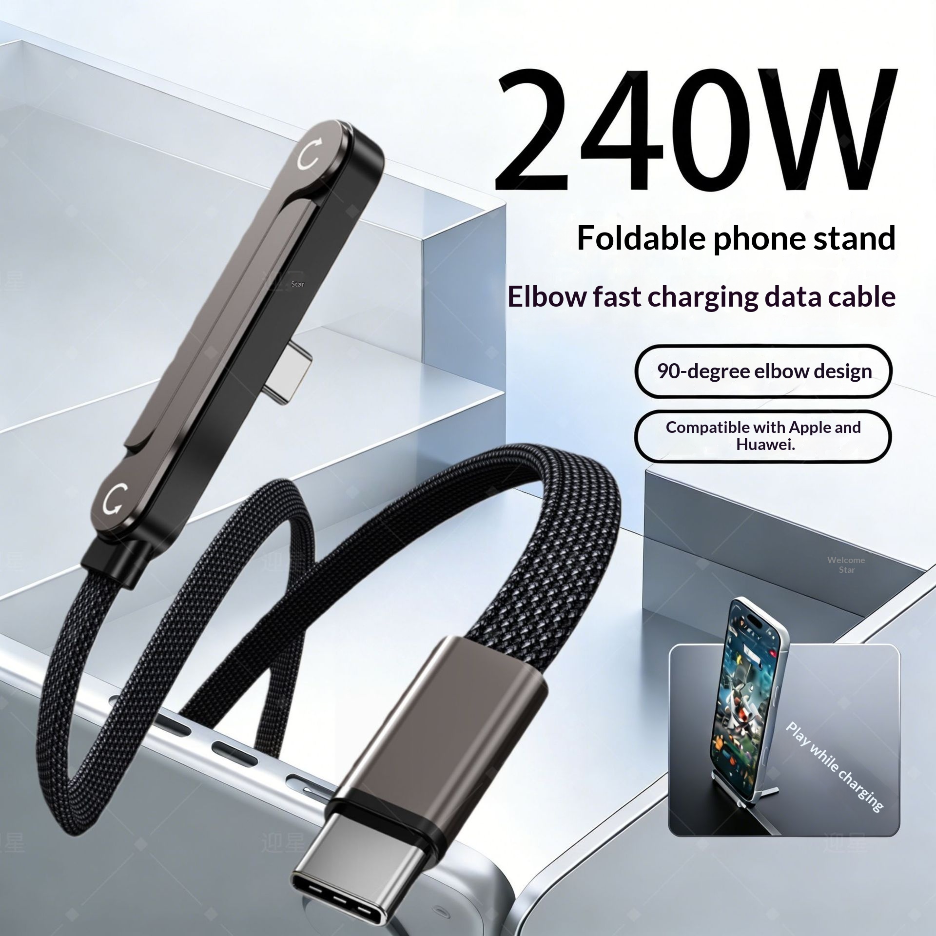 Cable Dual-C Trenzado 240W con Soporte Plegable y Conector Ángulo Recto