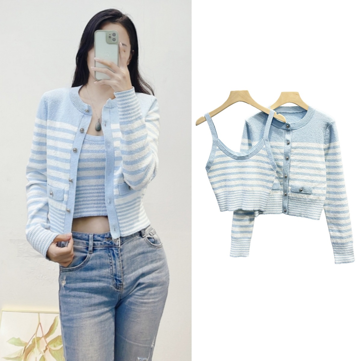 Womens Blue And White Striped Knitted Cardigan And Camisole Two-Piece Set